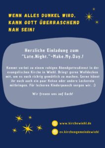 Kommt vorbei zu einem ruhigen Abendgottesdienst, in der evangelischen Kirche in Wiehl. Bringt gerne Wolldecken mit, um es euch richtig gemütlich zu machen. Gerne könnt ihr euch ein paar Kekse oder andere Leckereien mitbringen. Für leckeren Kinderpunsch sorgen wir. Wir freuen uns auf euch!